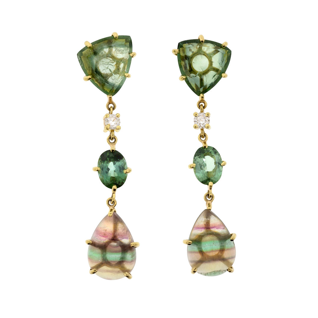 18K One of a Kind 3-Tier Gemstone Earrings: Green Tourmaline Slice, Faceted Green Tourmaline, Rainbow Fluorite & Diamond