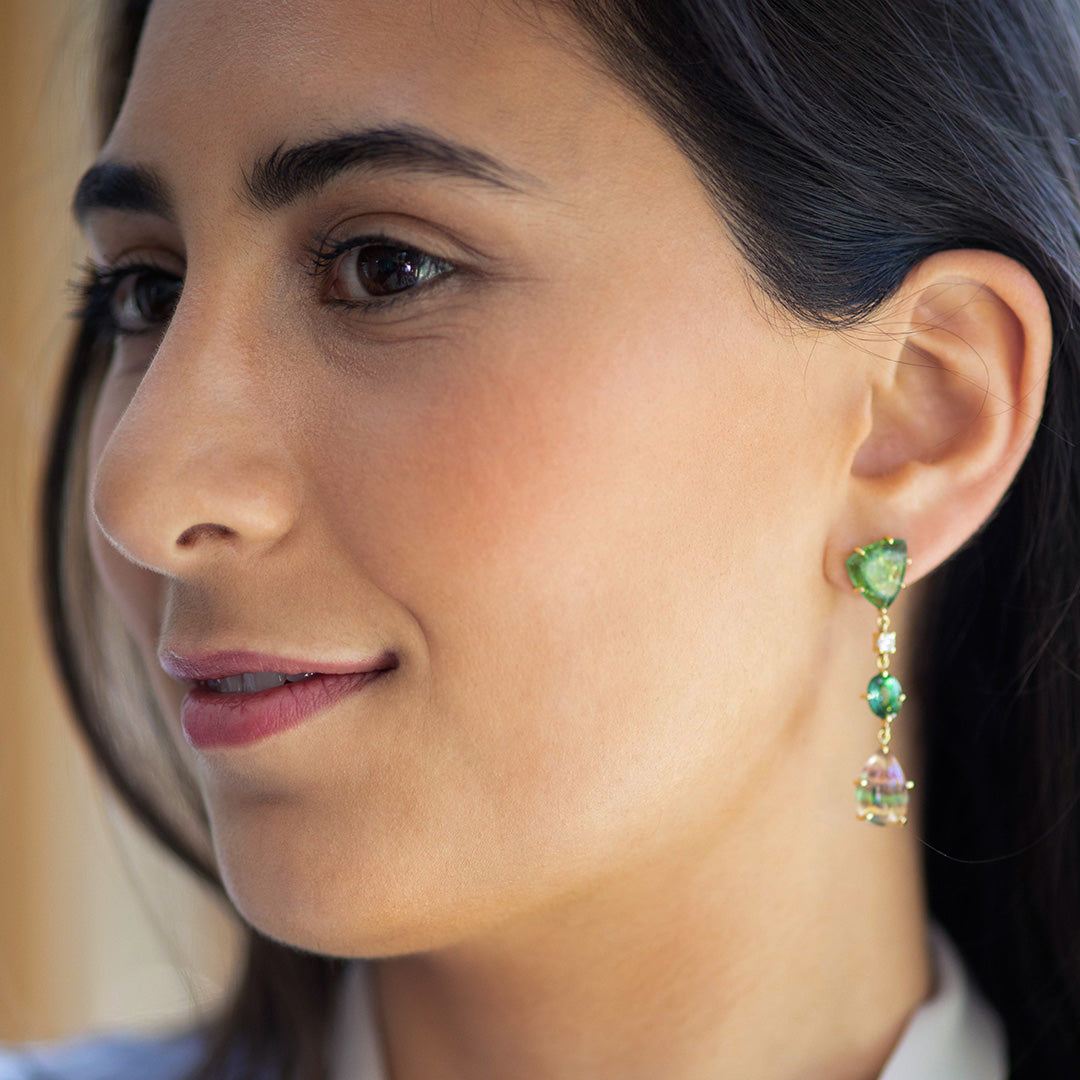 Zhangye Danxia 18K One of a Kind 3-Tier Gemstone Earrings: Green Tourmaline Slice, Faceted Green Tourmaline, Rainbow Fluorite & Diamond