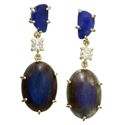 Mulu 18K One of a Kind 2-Tier Gemstone Earrings: Boulder Opal Doublet, Diamond, and Labradorite
