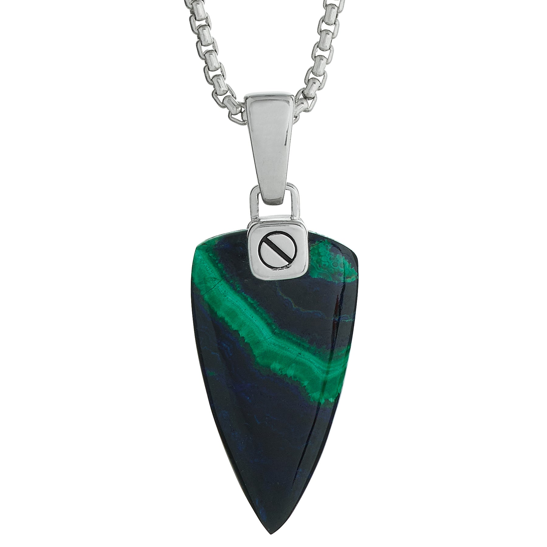 Azurite malachite, prized by collectors for its swirls of deep blue and vibrant green hues, is believed to strengthen the connection to the third eye. Carved into an arrow silhouette and set onto 925 sterling silver, this is a naturally one-of-a-kind pendant.
