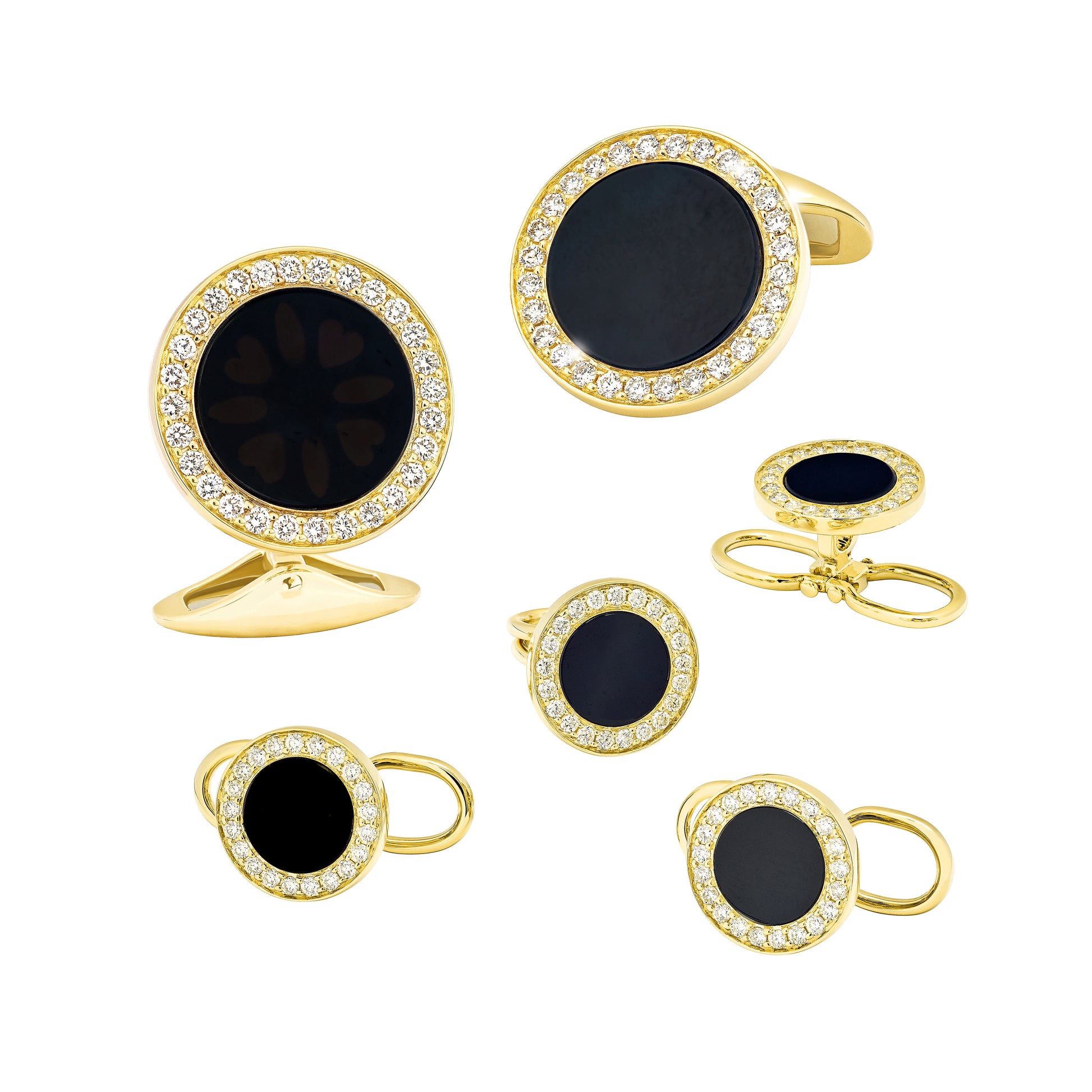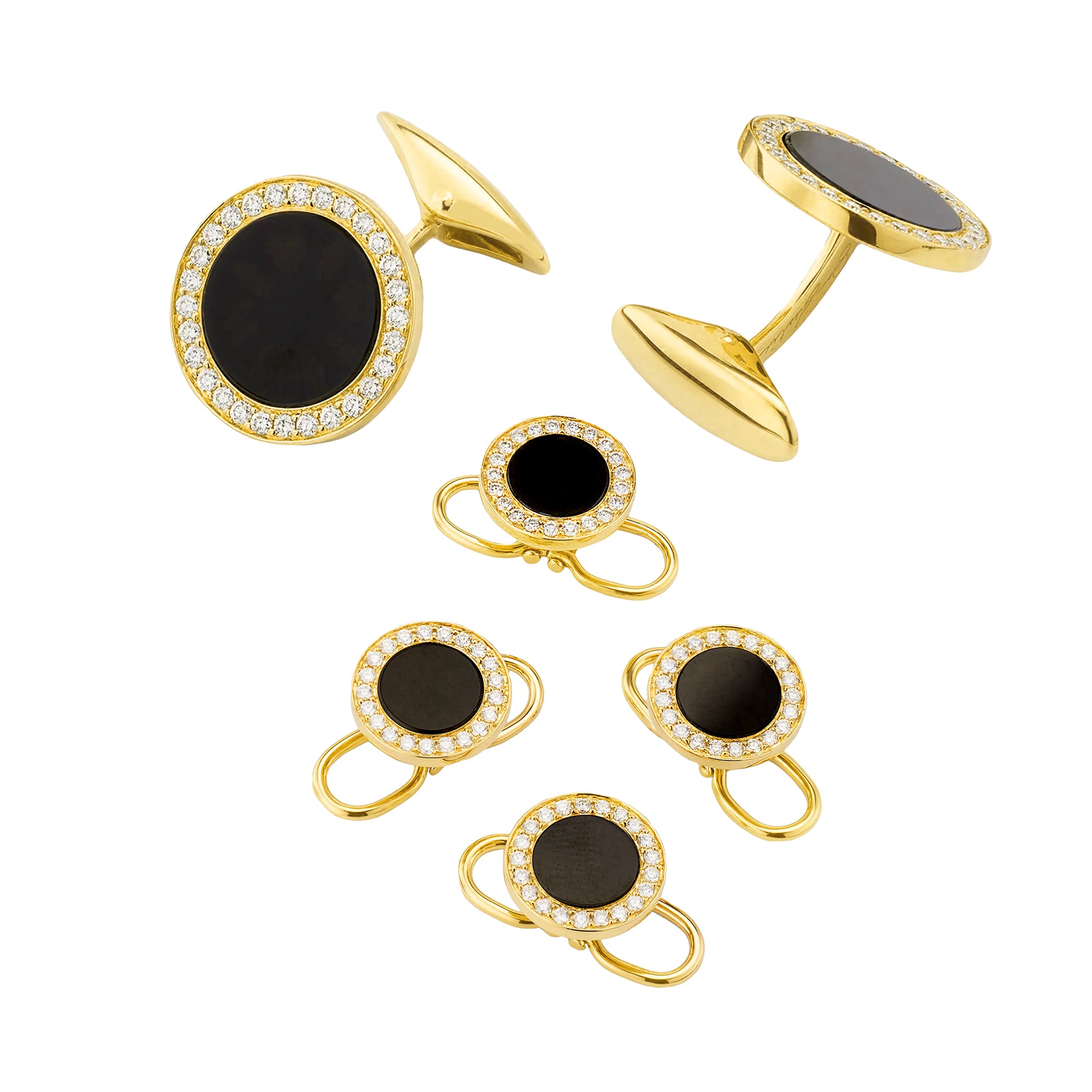 Genuine black onyx gemstones are set by hand onto classic 18K gold cufflinks and tuxedo studs. Sparkling diamonds add unexpected flash while perfectly complementing the natural gemstones.
