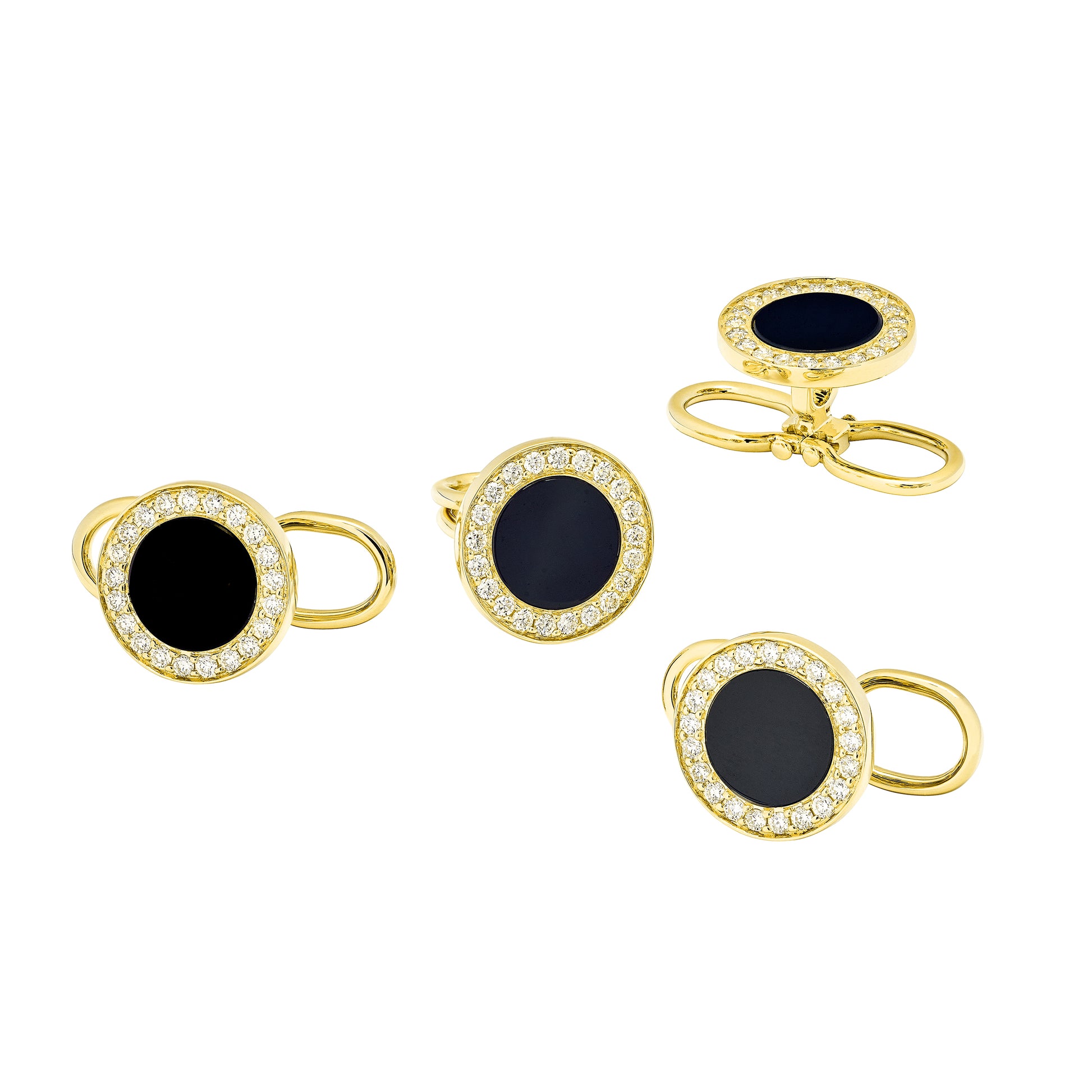 Genuine black onyx gemstones are set by hand onto round 18 Karat gold tuxedo studs. Sparkling diamonds add unexpected flash while perfectly complementing the natural Black Onyx