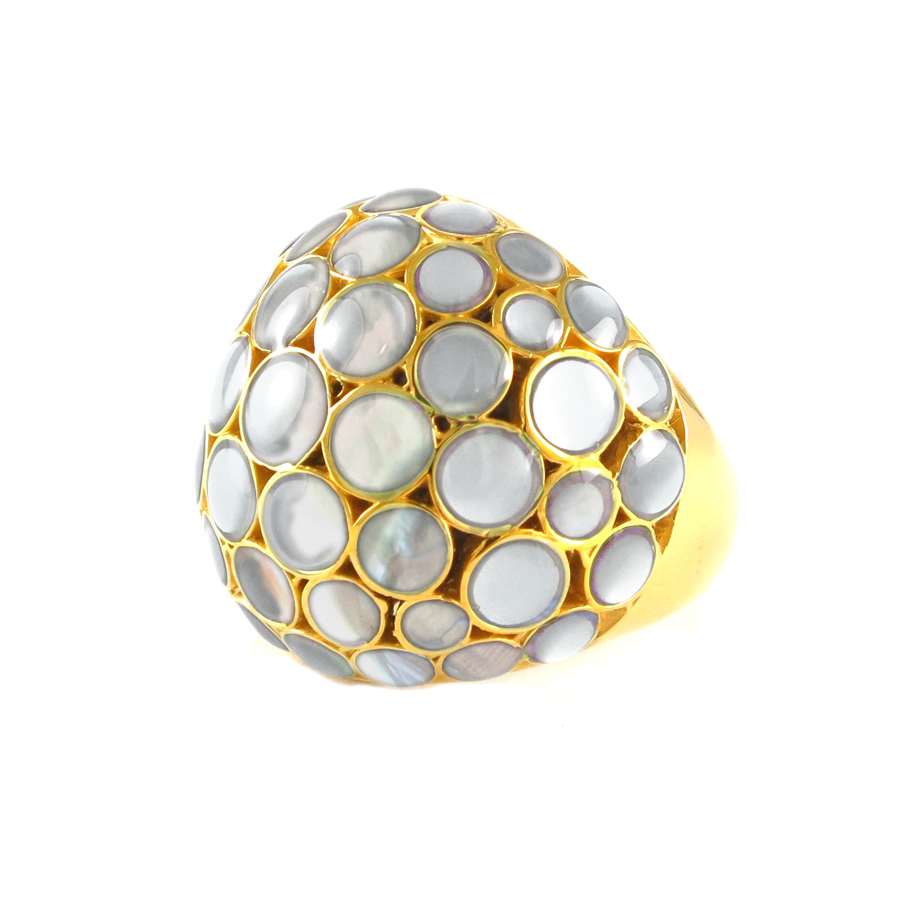 The Jan Leslie Bubble Collection features mother of pearl gemstones layered with vibrant hand painted enamel set across a domed shaped 18k gold vermeil finish sterling silver for a distinctive grand opalescence.