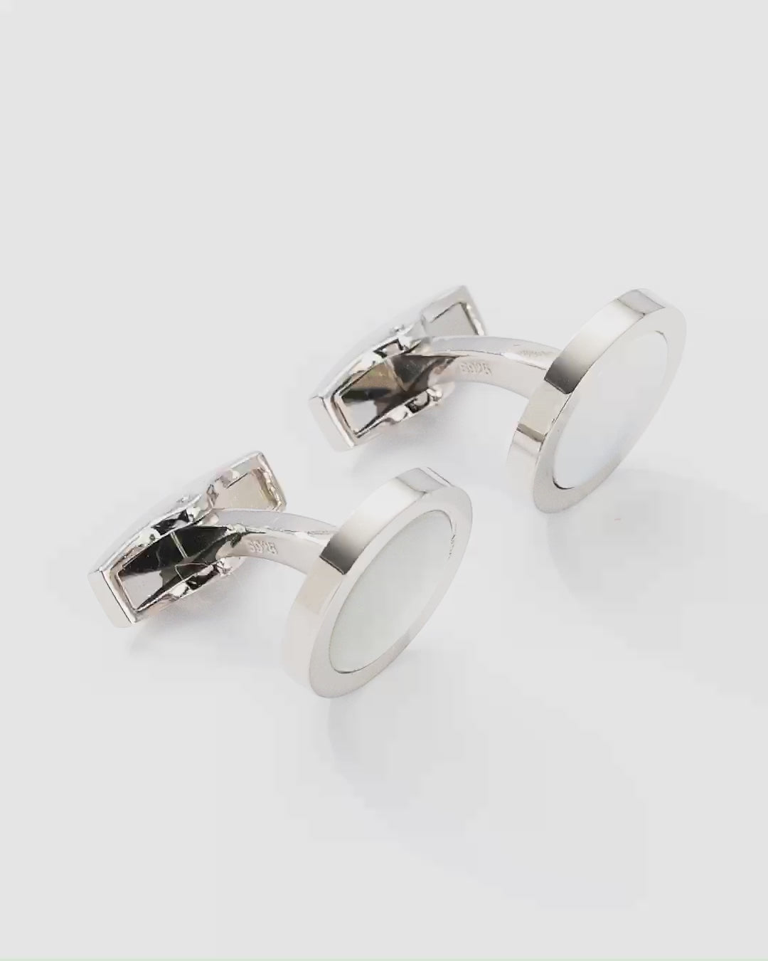 Carefully inlaid Mother of Pearl on 925 Sterling Silver cufflinks in a classic round silhouette are an effortlessly elegant way to elevate a black-tie.