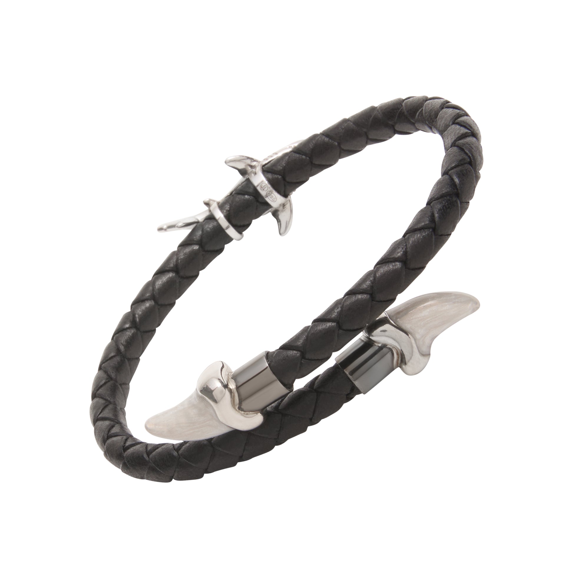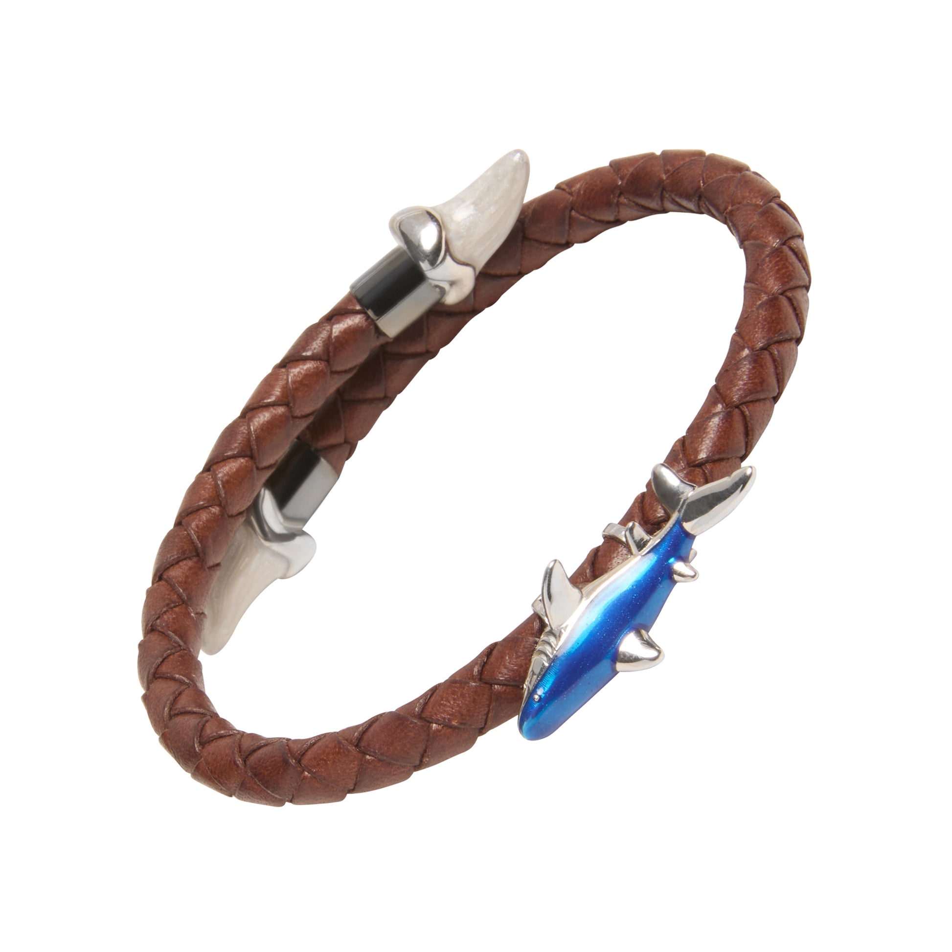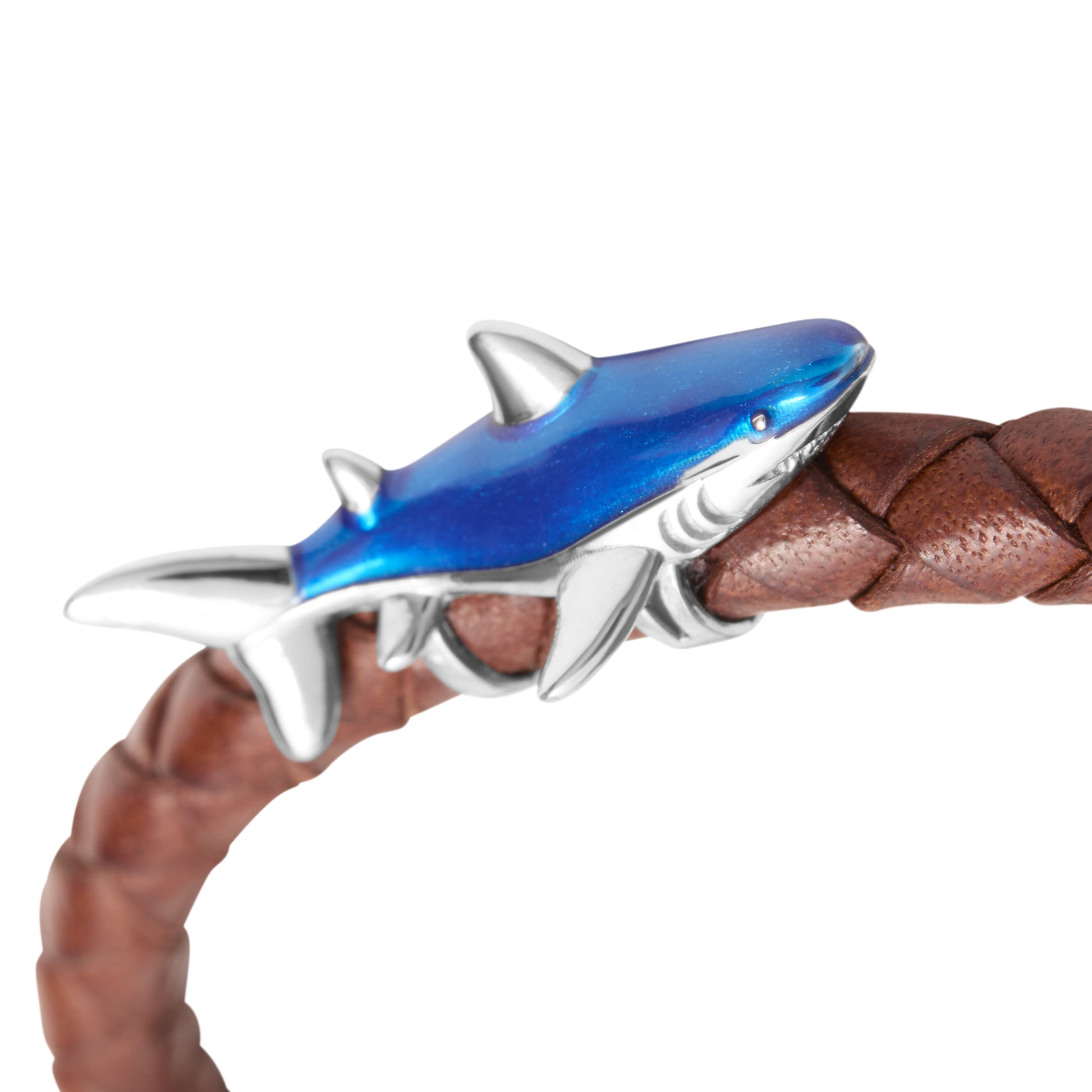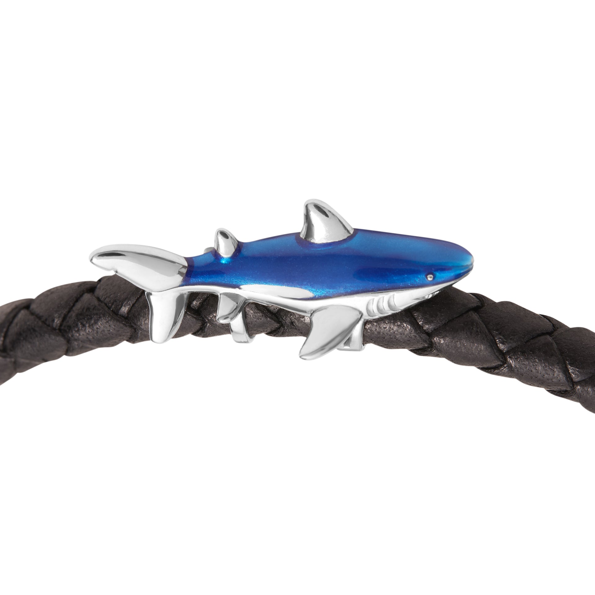 Sterling silver and leather spring bracelet accented with shark hand-painted with blue enamel and tipped with sterling and enamel shark teeth.