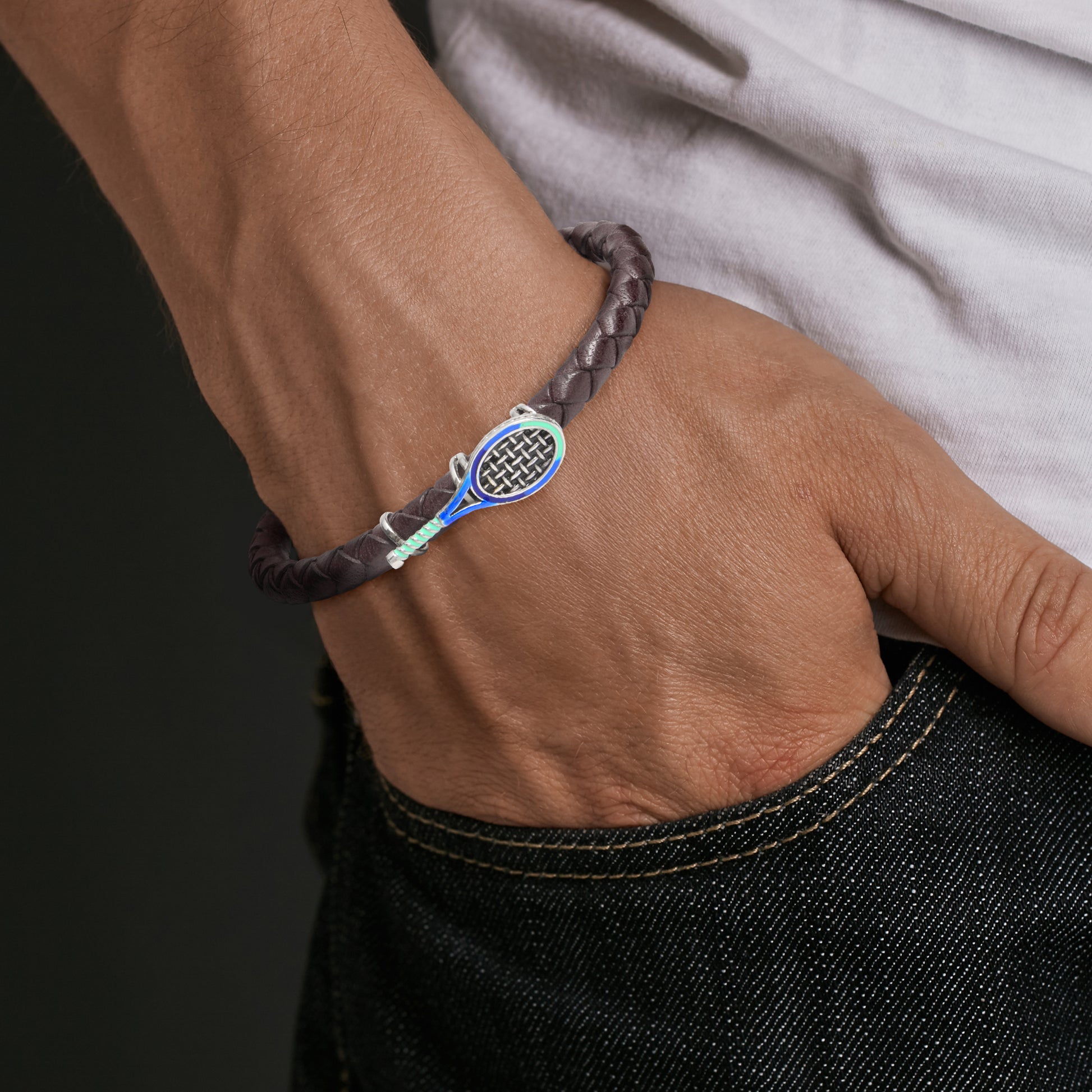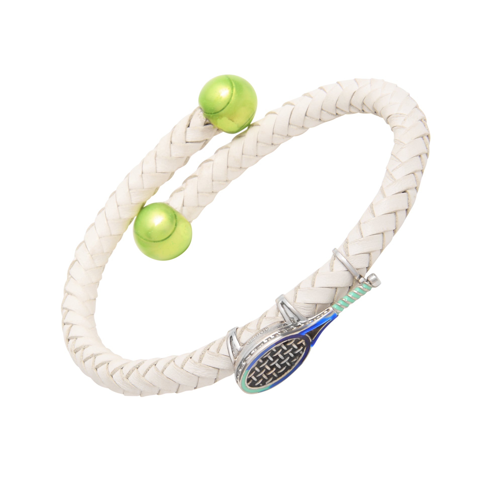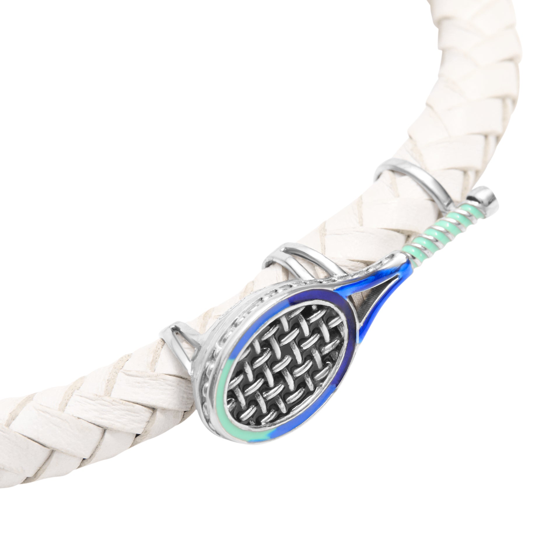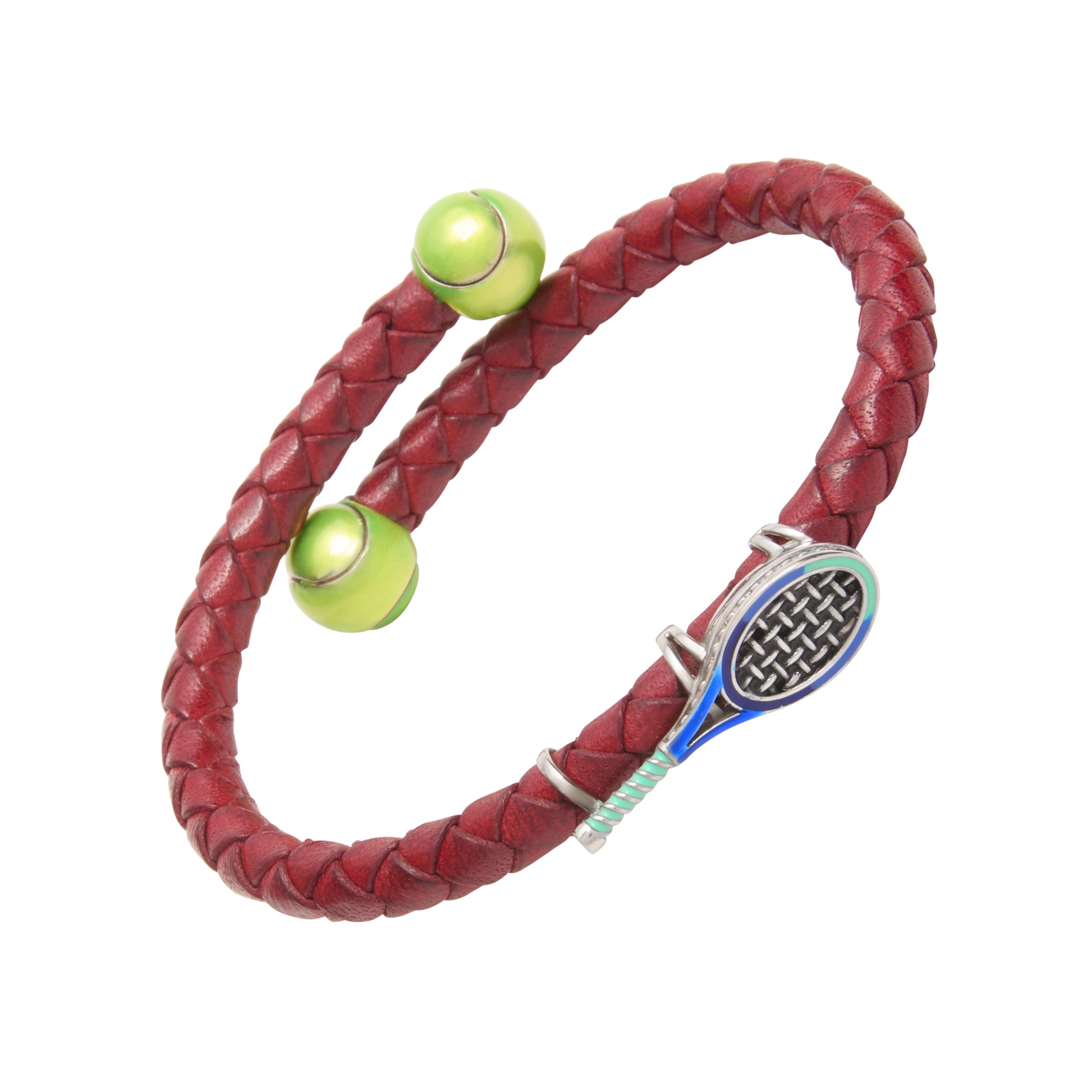 Serve up winning style with our sterling silver and leather spring bracelet accented with tennis racquet hand-painted with blue enamel and tipped with sterling and enamel tennis balls.