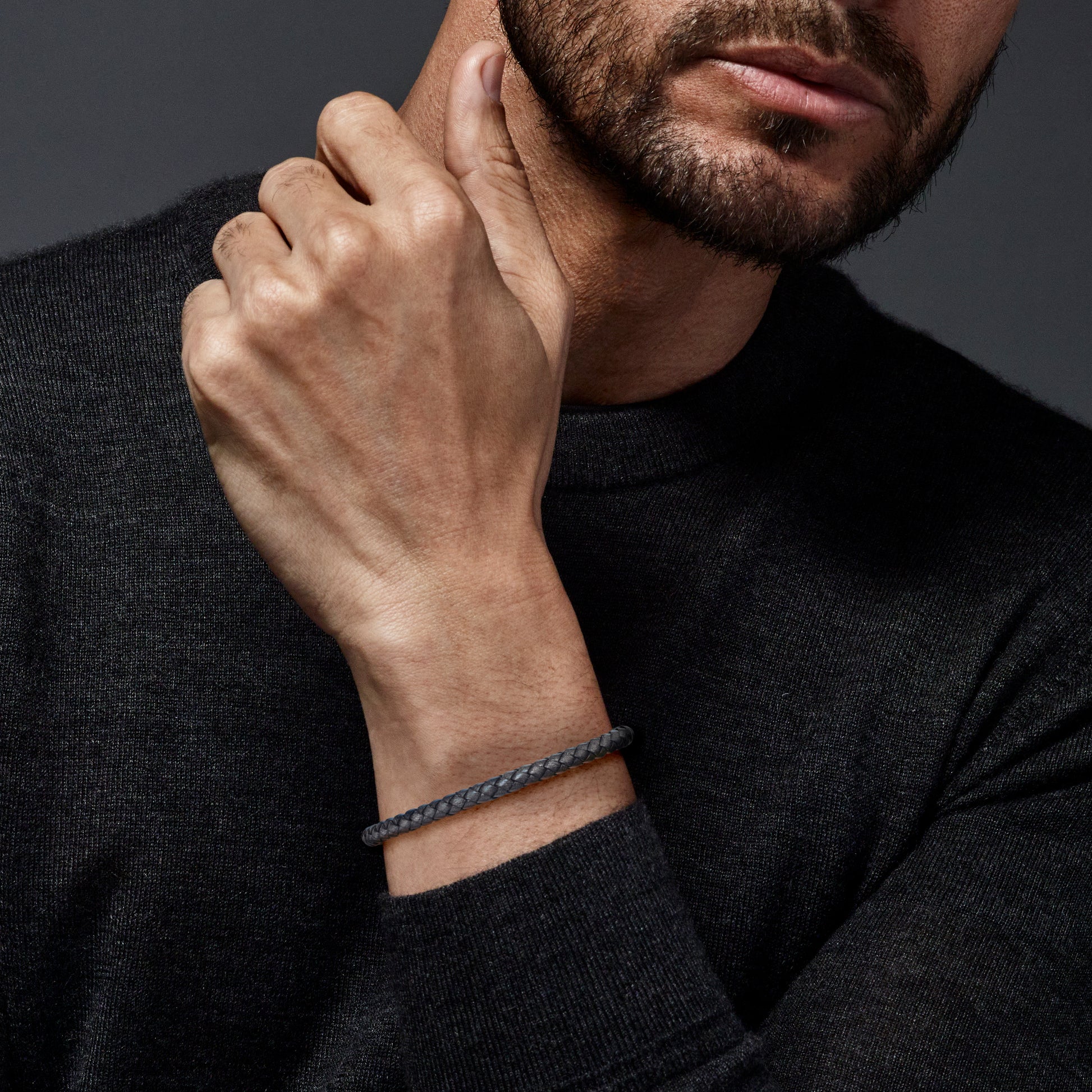 An adjustable men's bracelet features a flexible spring interior that gently hugs the wrist — no clasp needed. wear it on its own or stack with stone or sterling Bracelets.