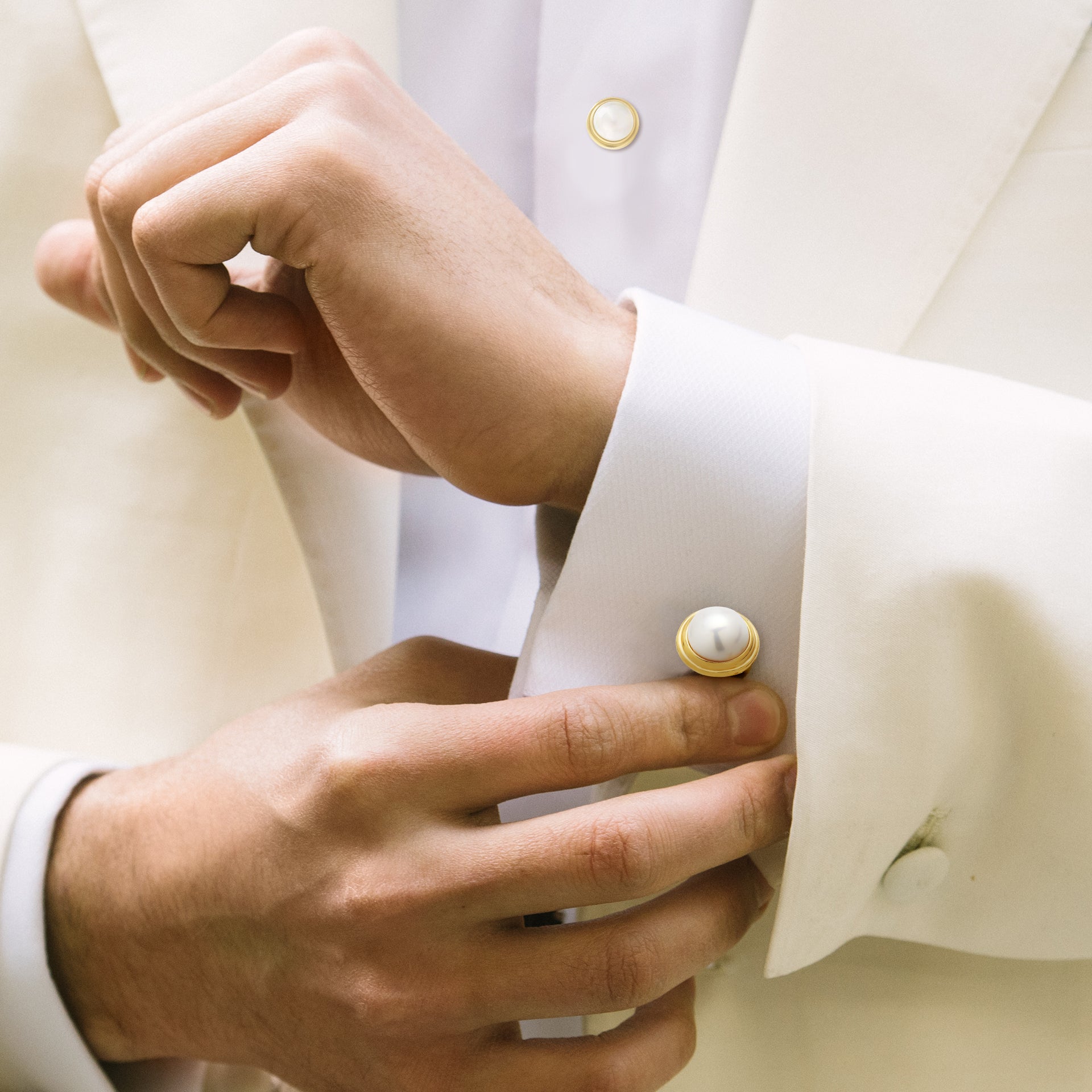 These Pearl tuxedo studs are vintage-inspired thick 18K Yellow Gold borders,