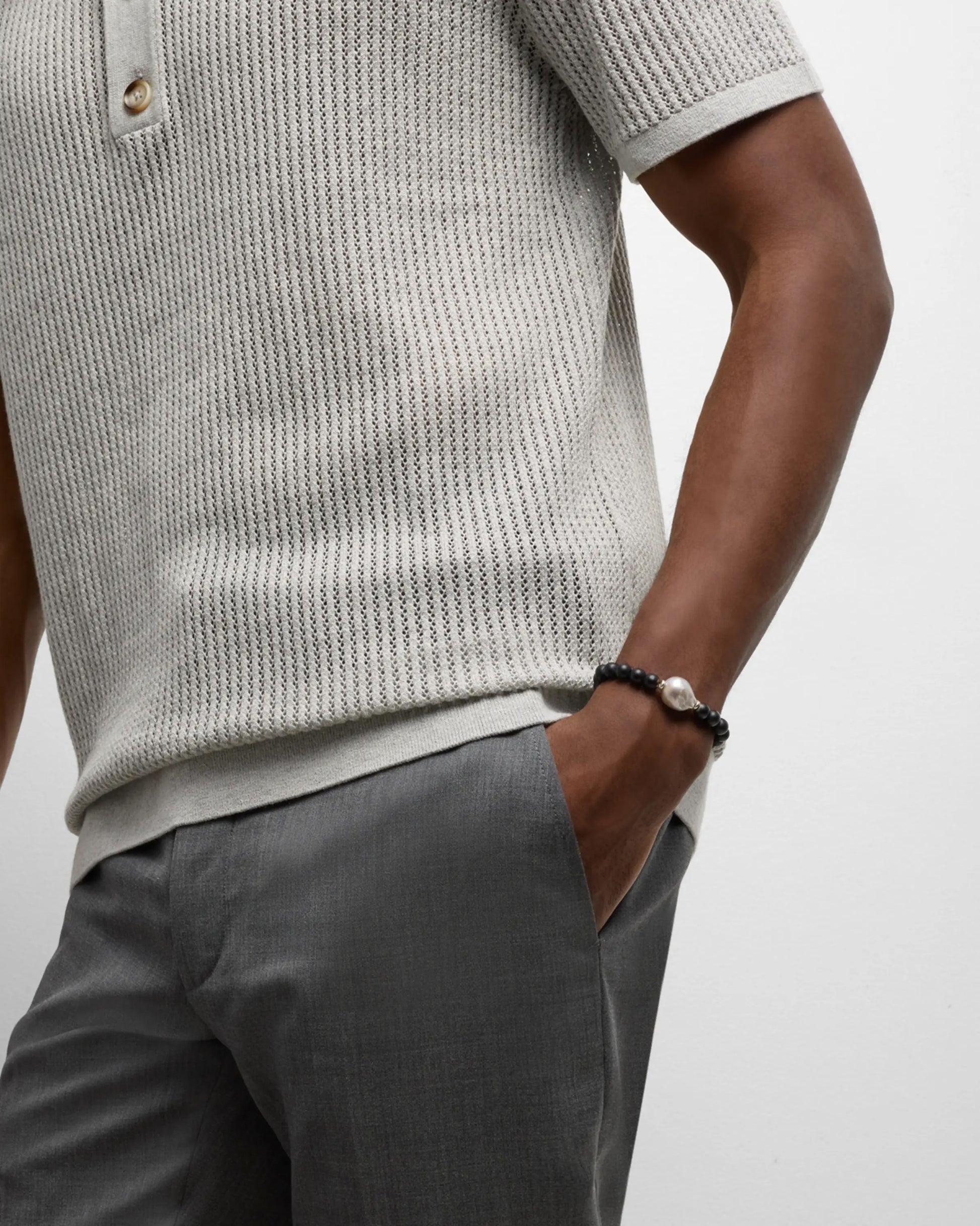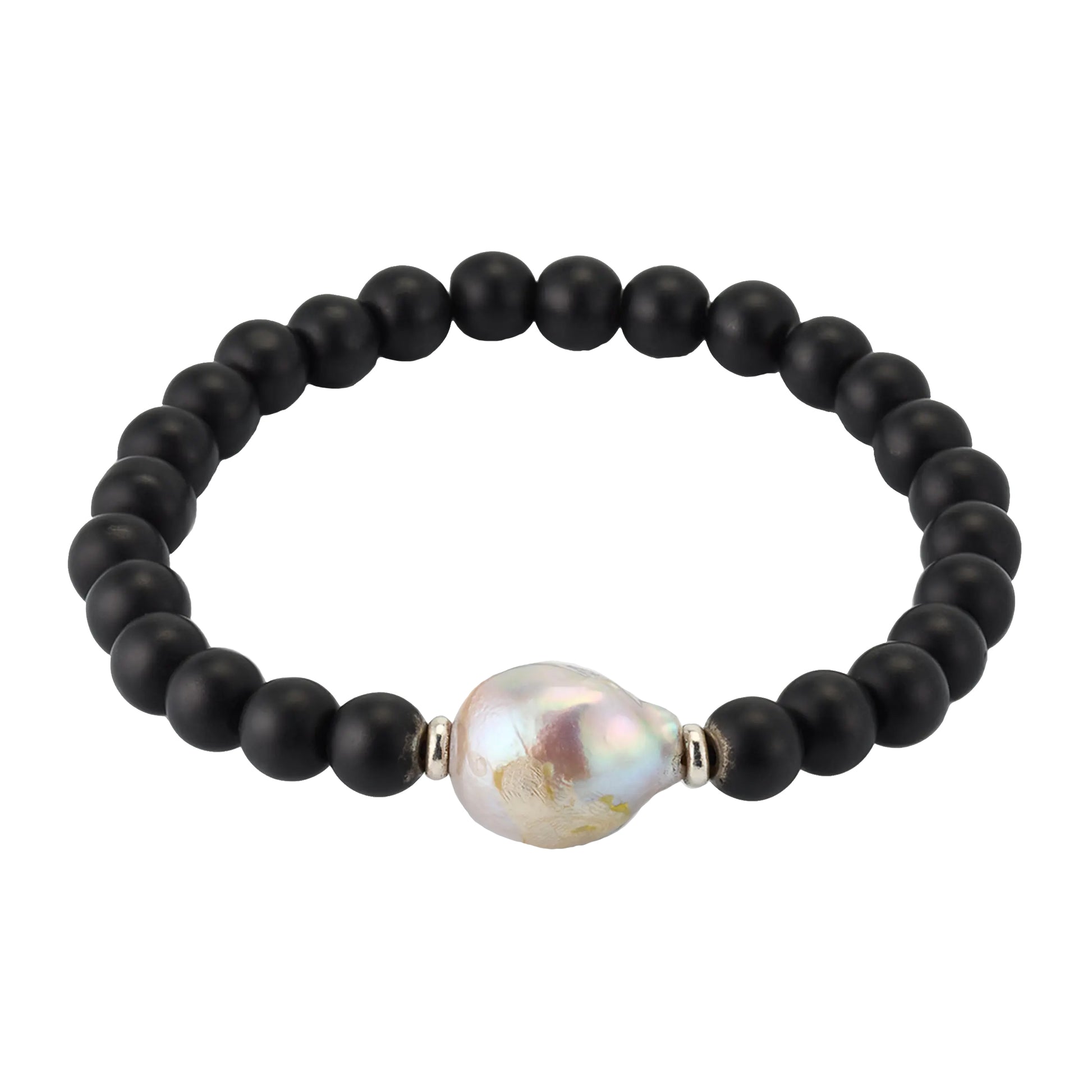 Black onyx round faceted stones offset the naturally hued natural freshwater pearl in this bracelet that features sterling silver spacers for more sparkle. All stones are naturally one-of-a-kind, hand-selected by Jan Leslie for best match.