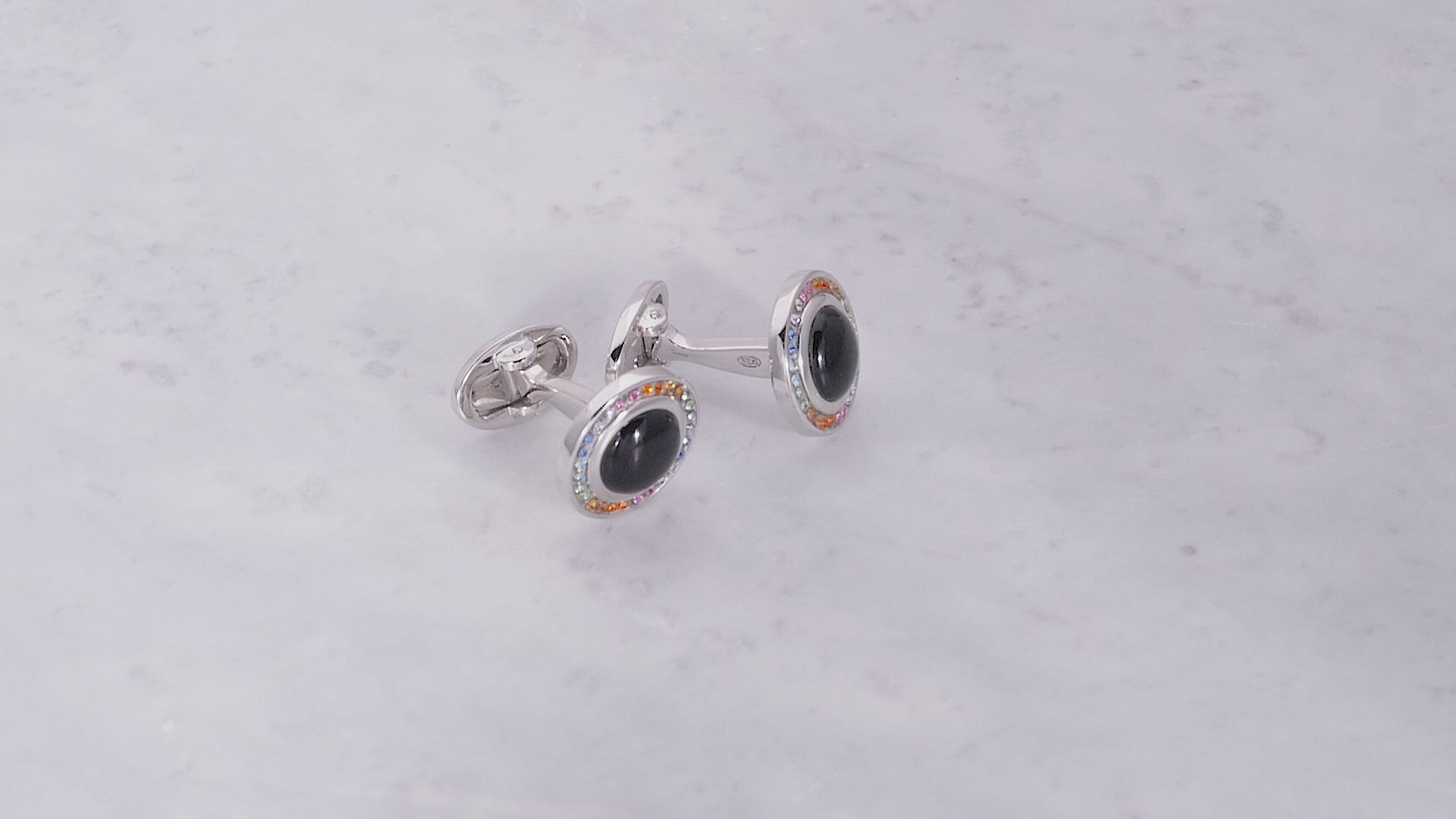 Genuine onyx gemstones are set by hand along with rainbow border of crystals. Vintage style meets Rainbows. An unexpected flash while perfectly complementing the natural gemstones.