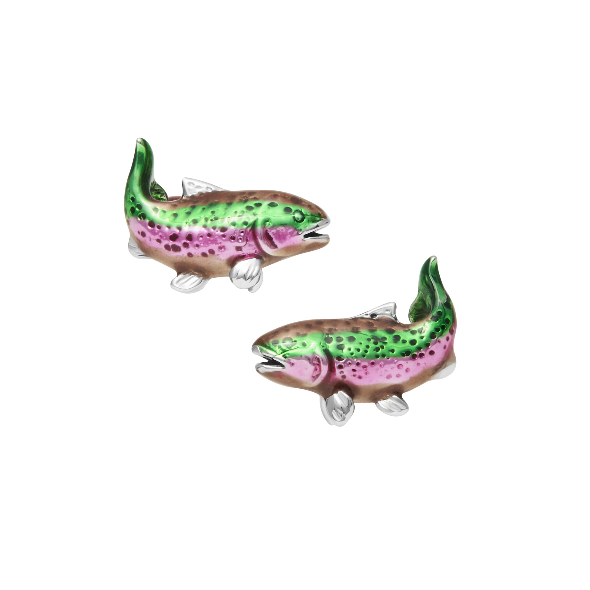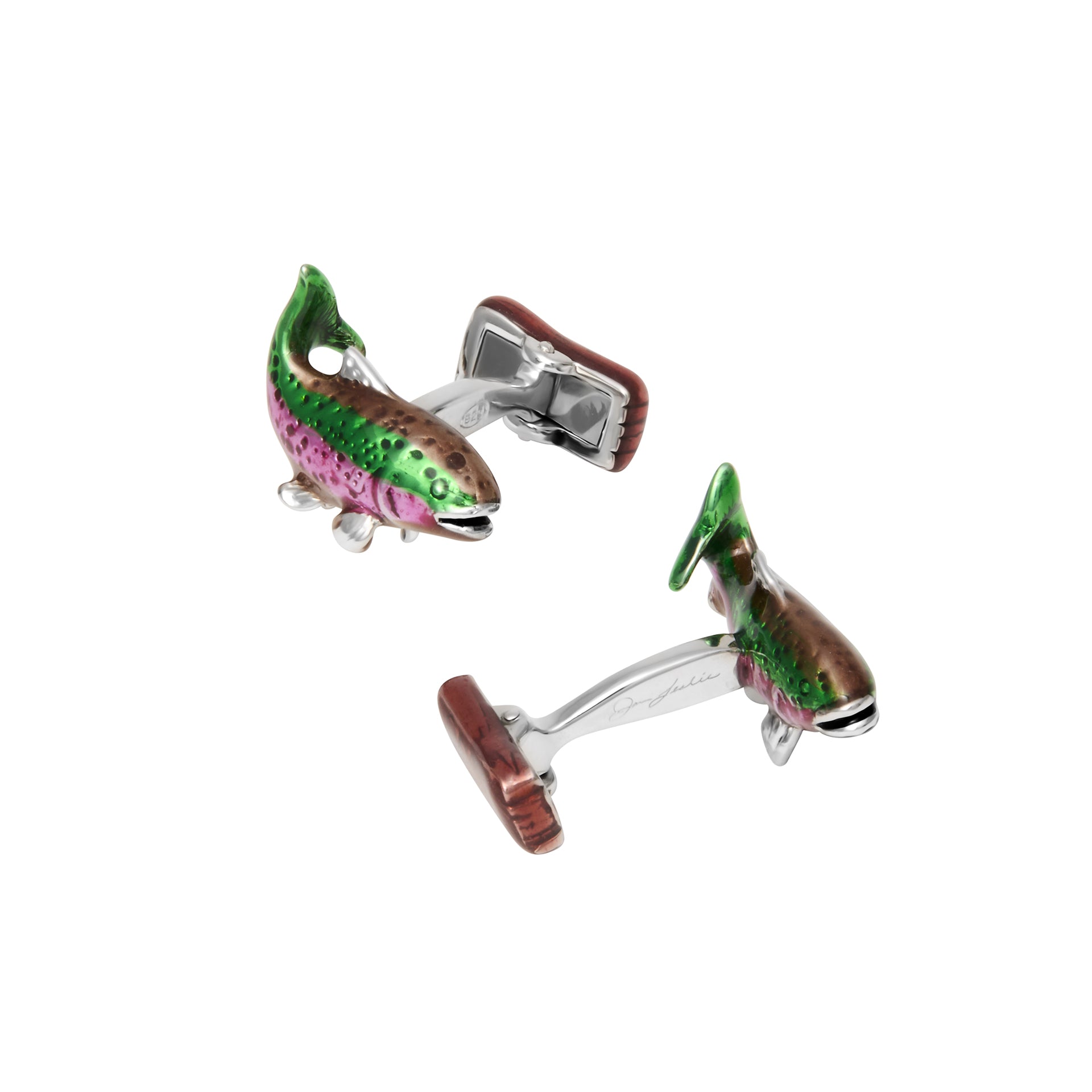 Sterling silver trout cufflinks with hand painted enamel and Gone Fishing sign backs.