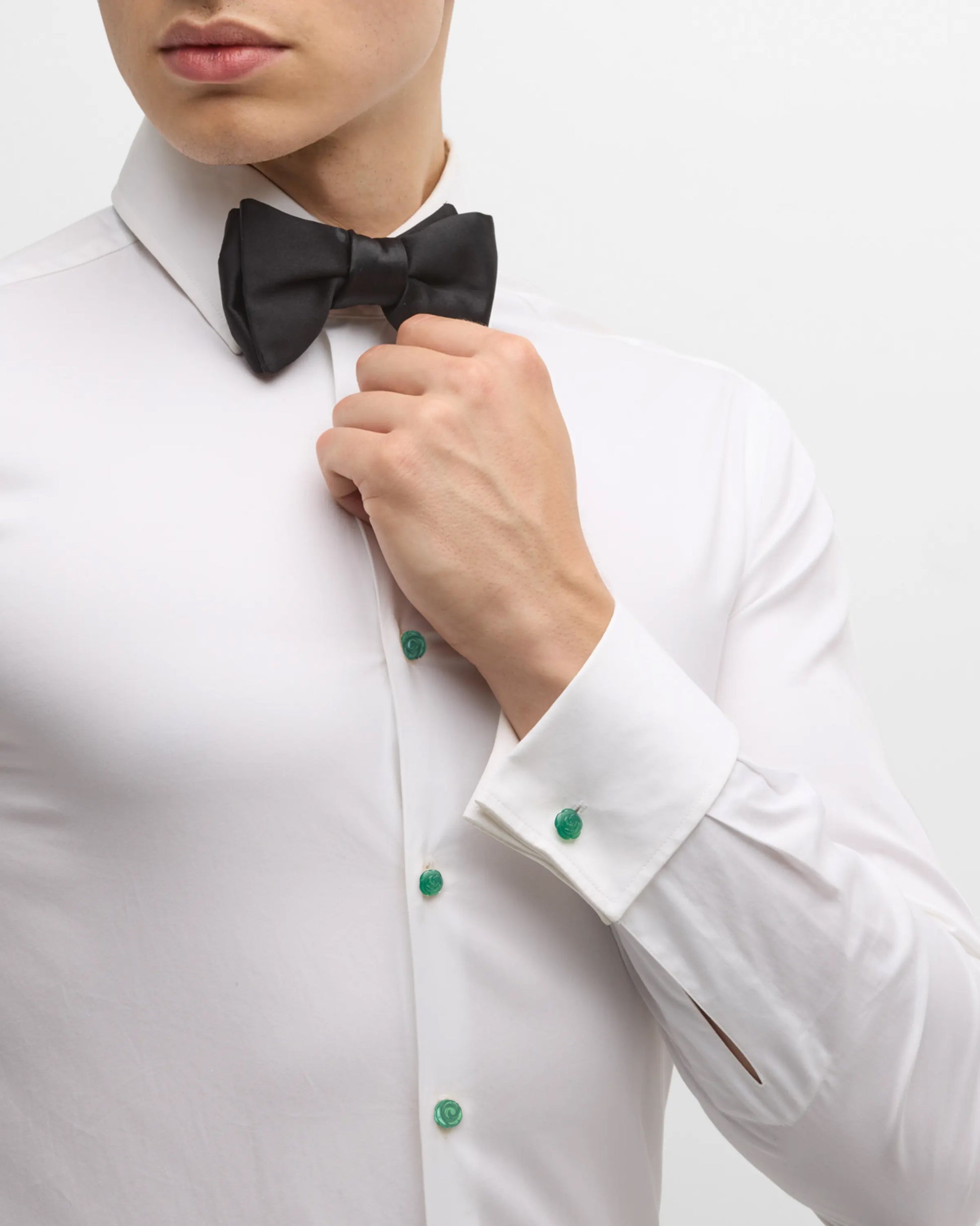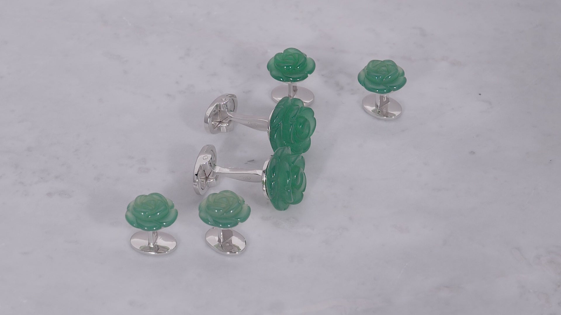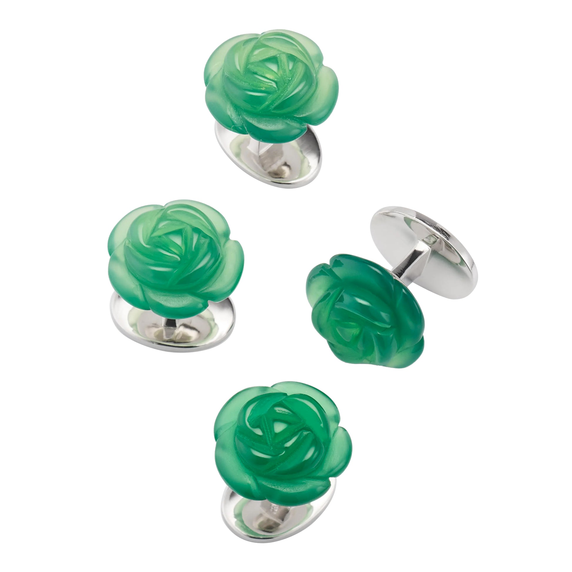Hand Carved Green Agate Gemstone Rose Sterling Silver Cufflinks and Tuxedo Studs. This bestselling formal set adds a touch of romance. Available in Blue Lapis And Green Agate carved by hand into intricate 925 sterling silver cufflinks and tuxedo studs. We love them for weddings, but they're great for any black tie occasion.