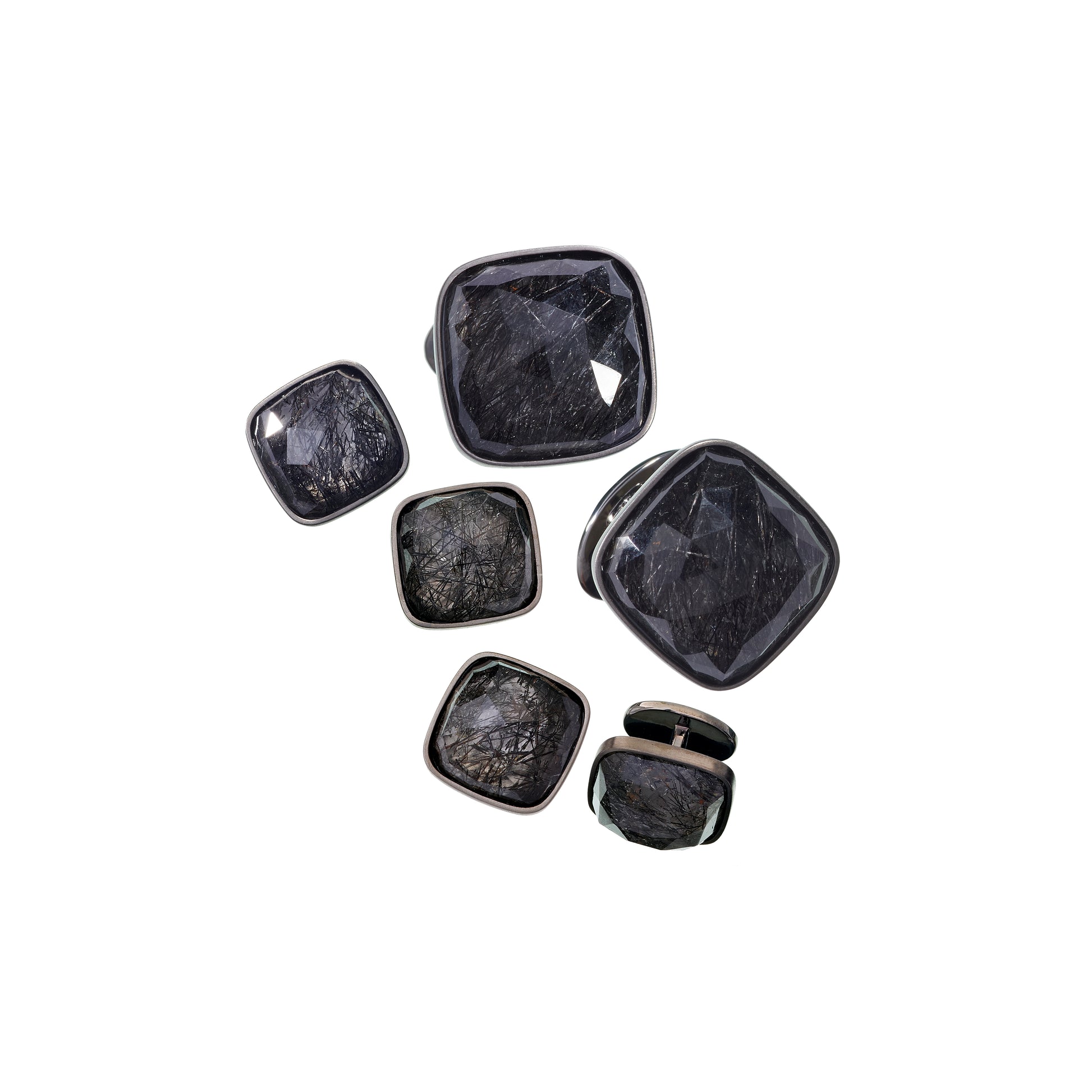 Rutilated quartz is distinguished by its intricate, needle-like strands of titanium dioxide. Meta-physicists believe these strands to be symbolic of the lines on a person's palms, and believe the stones themselves can enhance psychic ability. Set by hand on 925 sterling silver, Black Rutilated Quartz with Matte Ruthenium finish on Sterling Silver Cufflinks & Tuxedo Stud Set