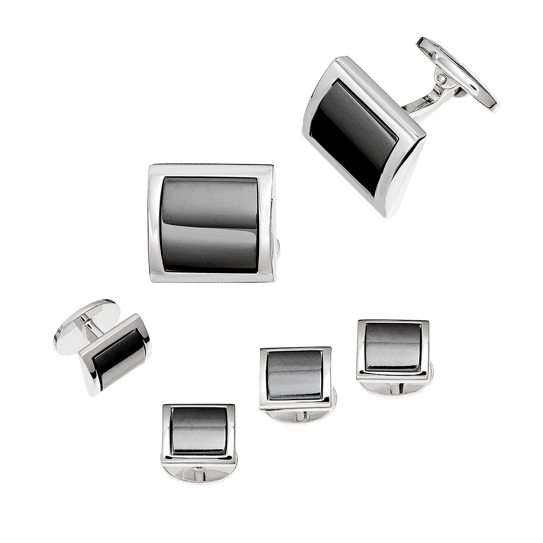 These understated Square Domed Hematite Gemstone Sterling Silver Cufflinks and Tuxedo Studs feature hematite gemstones in a modern, sleek shape.