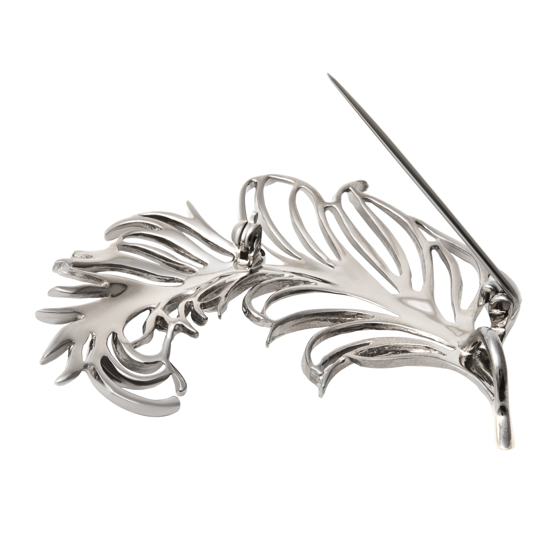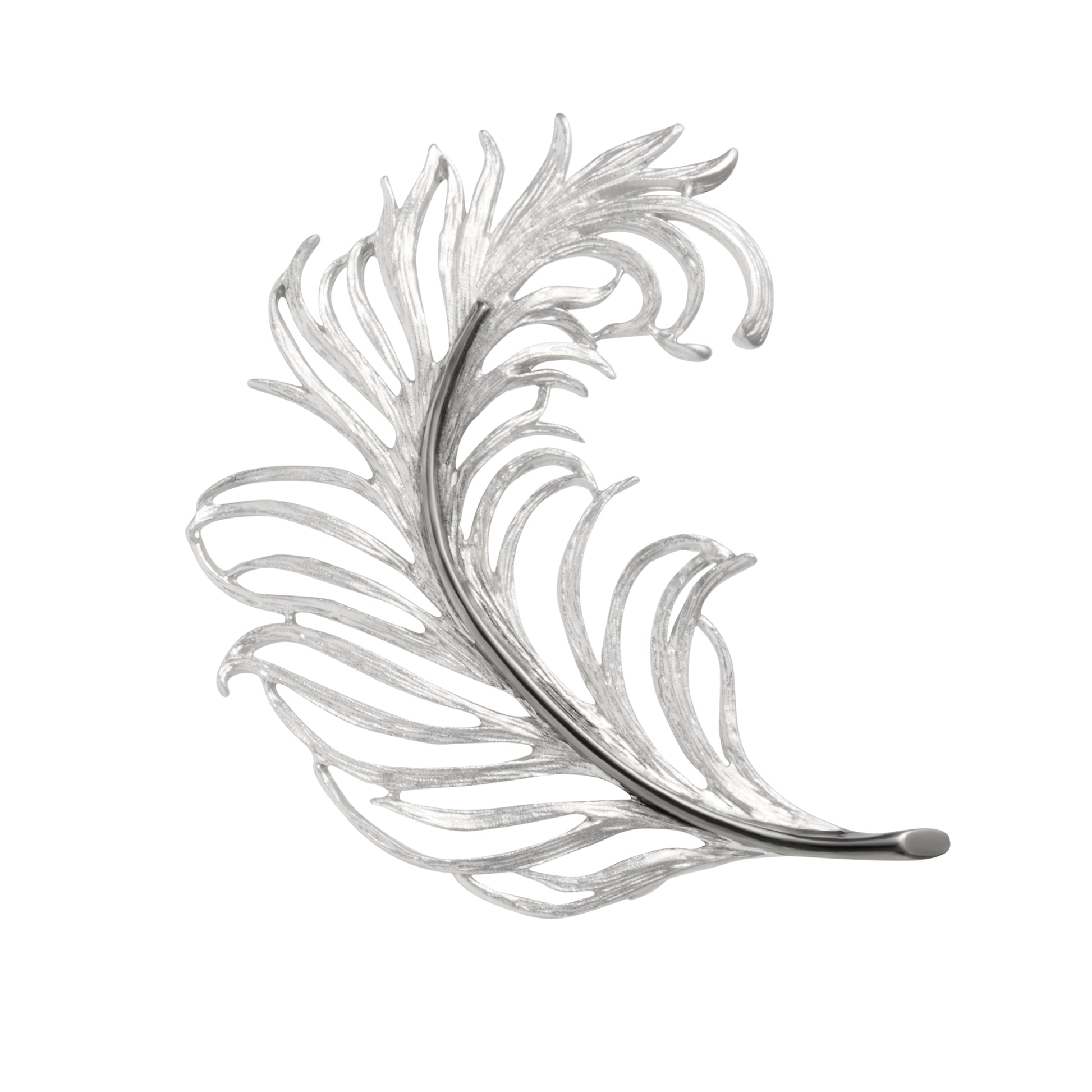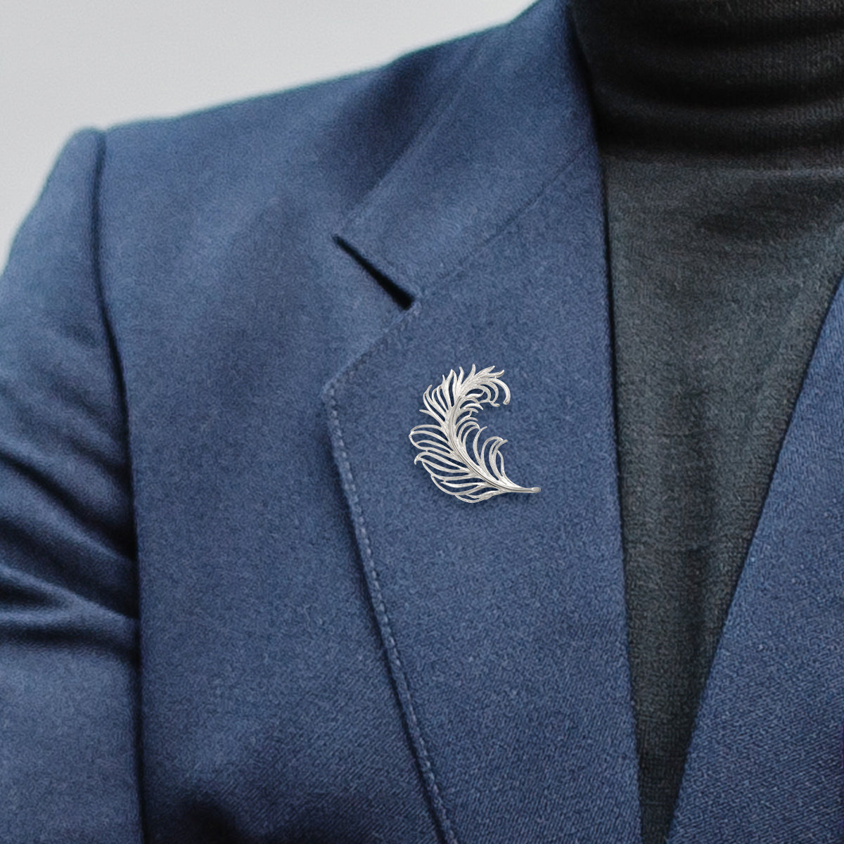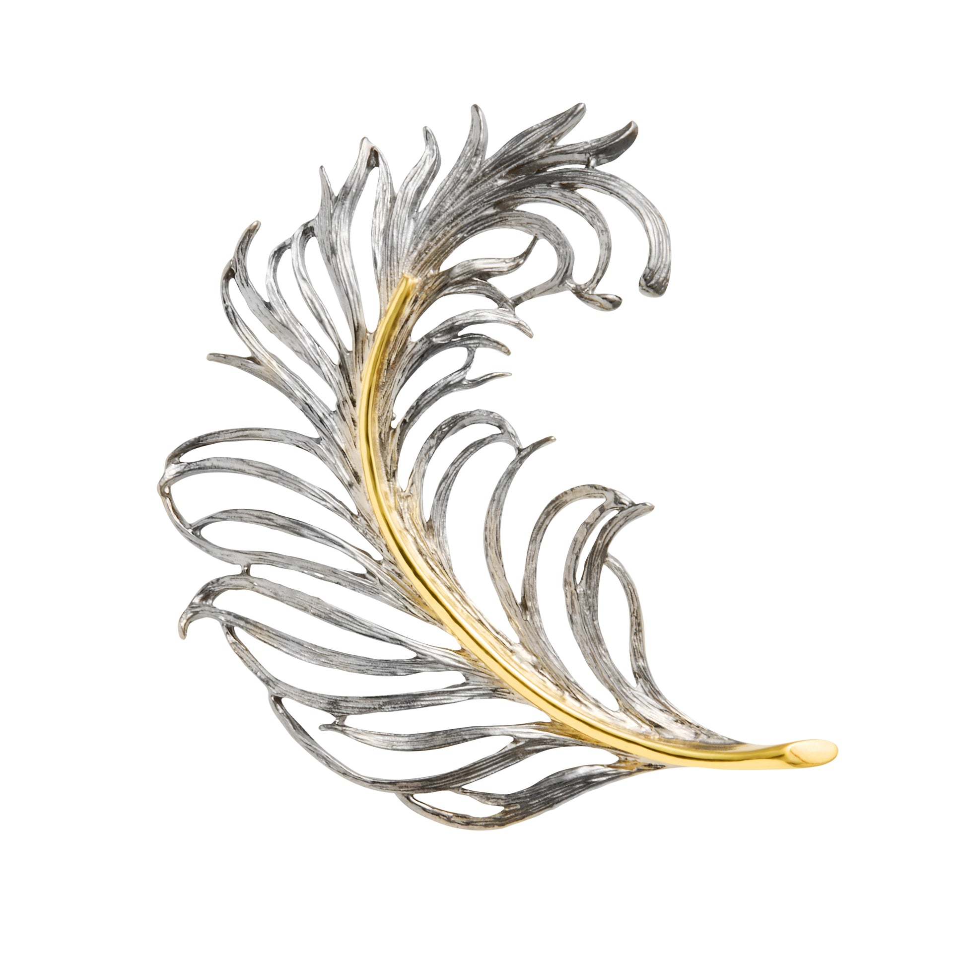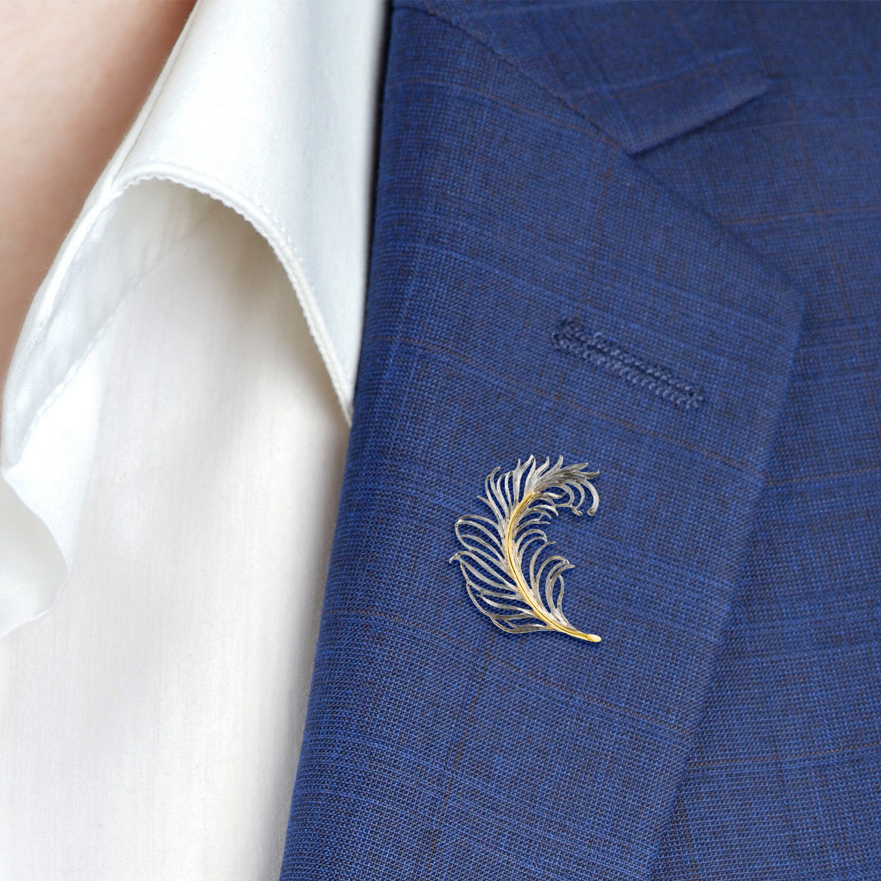 Meticulously crafted sterling silver Feather lapel pin in sterling silver with black ruthenium & 18k gold vermeil center detail or silver with black ruthenium center detail