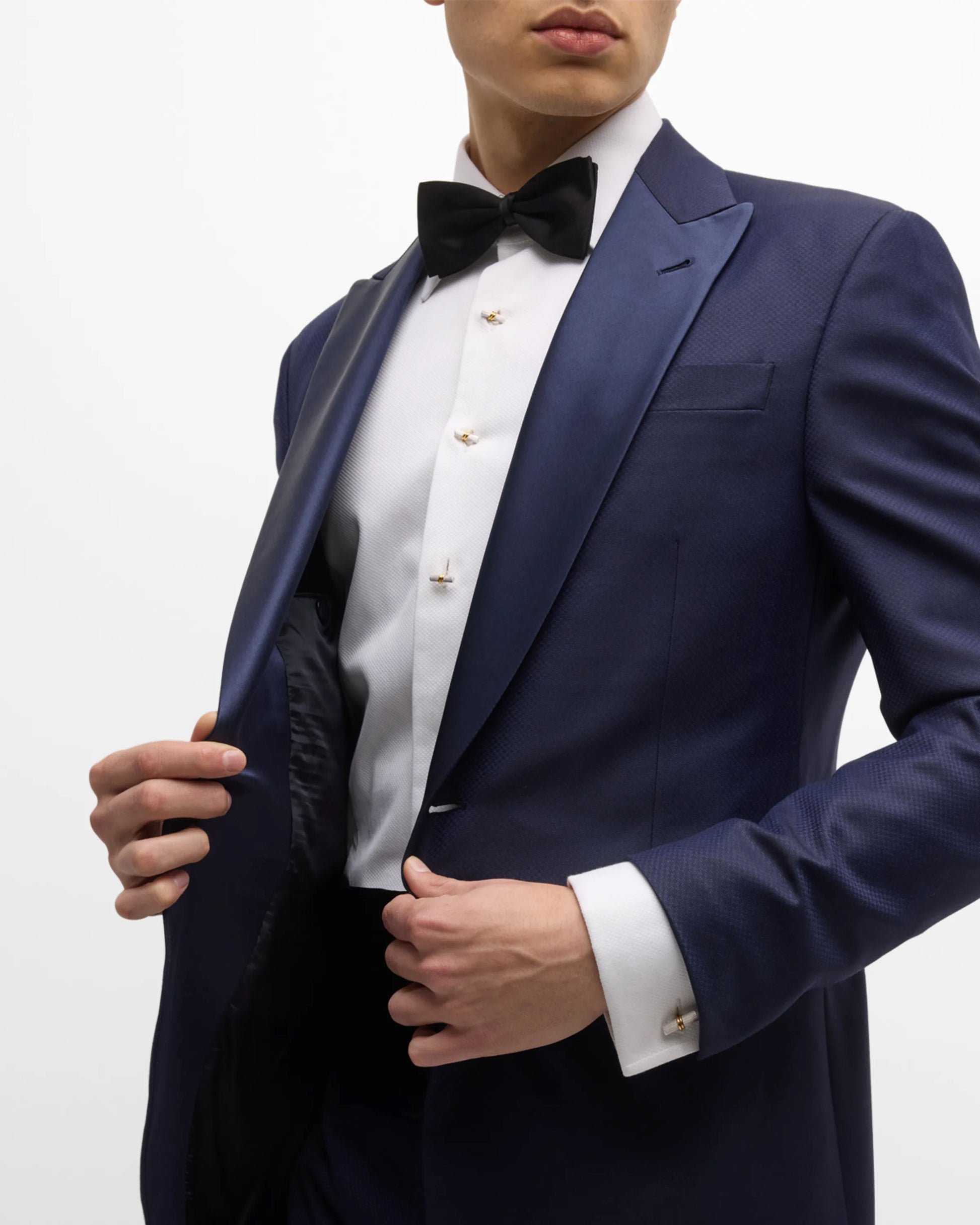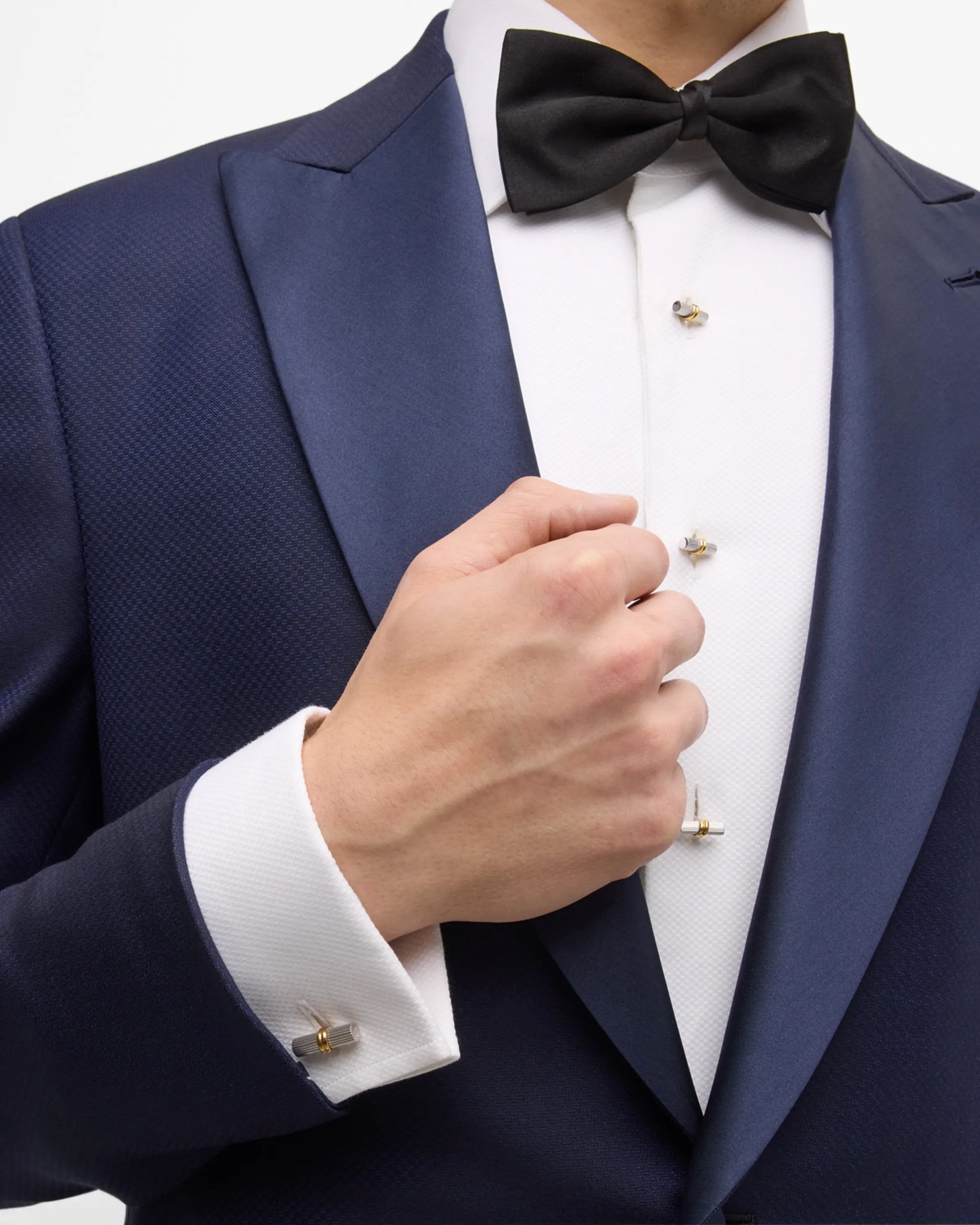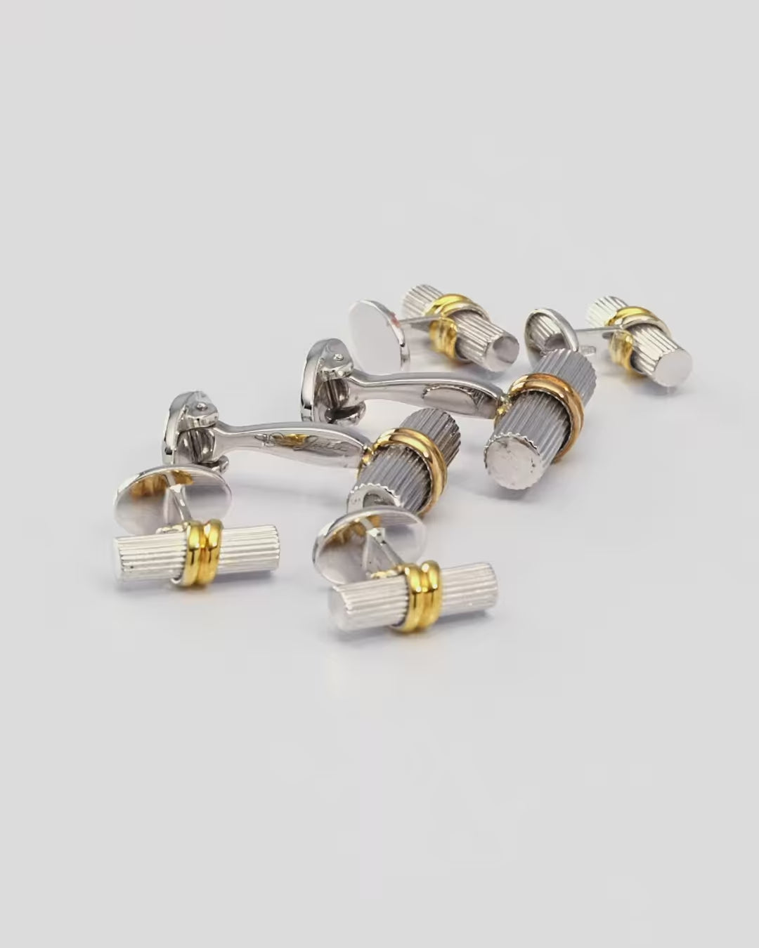 Pillar cuff links and studs formal tuxedo set with etched texture and 18K Gold Vermeil ribbon detail.