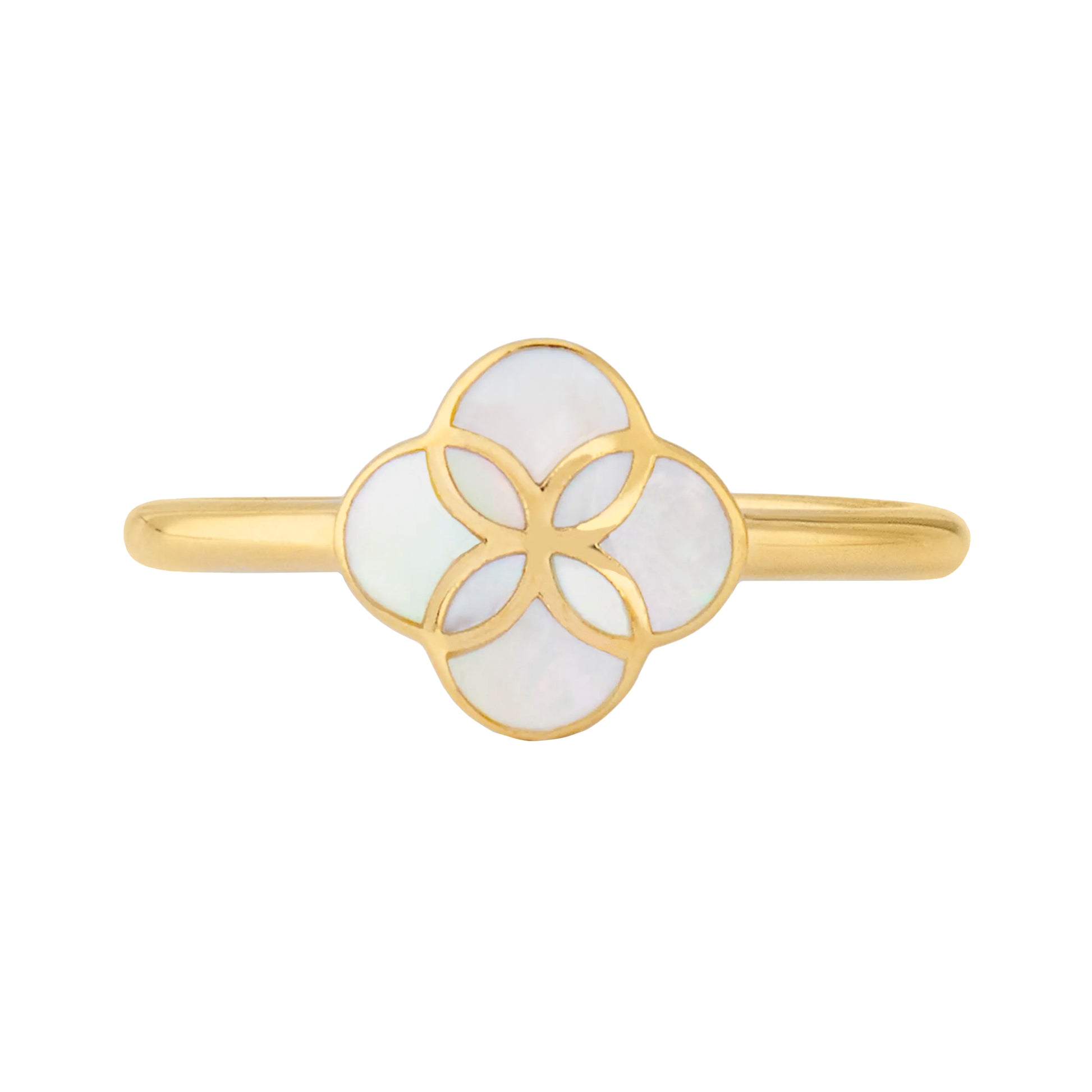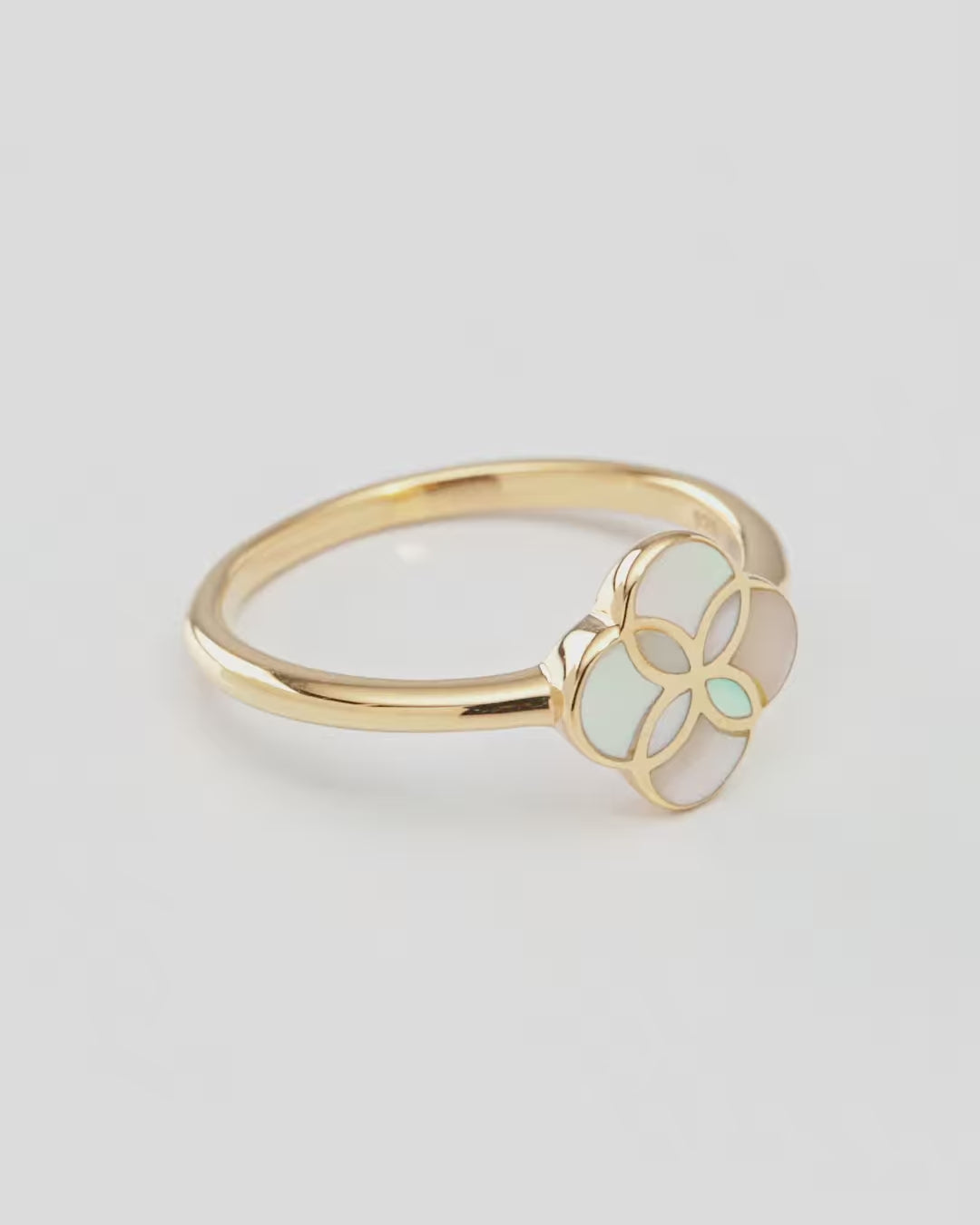 This Petal Ring features genuine mother of pearl gemstones set by hand onto a 925 sterling silver ring with 18K Gold vermeil finish. Add with matching pieces from the Jan Leslie Petal collection